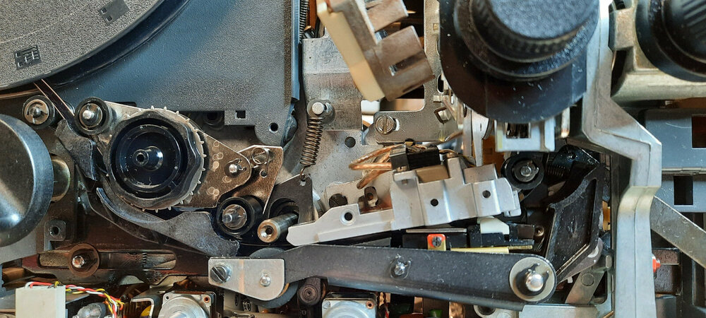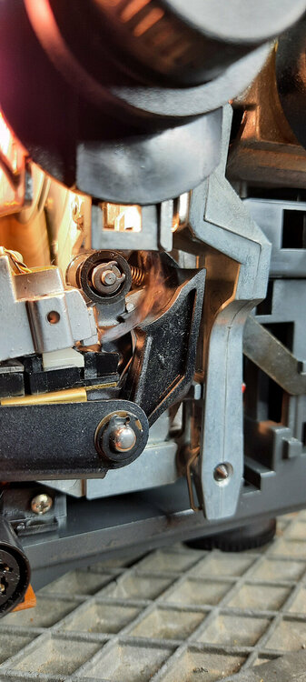 Ich habe nun den Projektor ganz aus dem Gehäuse genommen. Anders kommt man an den Abwickelmechanismus nicht dran. Danach habe ich den Auf- und auch den Abwickelmechanismus gereinigt und neu geschmiert. Verharzt war allerdings nichts. Jetzt ist auf jeden Fall alles leichtgängig. Das Rattern und Zittern ist besser, aber nicht gut. Eine Schnittstelle im Film genügt, um den Greifer wieder aus dem Takt zu bringen. Durch einen kurzen Druck auf den Schlaufenformer lässt sich das Bild dann wieder einfangen. Sobald die Schlaufe unter der Filmbühne zu straff wird, geht das Rattern los. Aber das Transportzahnrad kann ich nicht beeinflussen. Das meinte ich mit dem Satz aus meinem letzten Thread: "Die Aufwickelseite wird ja durch das über den Schneckentrieb fest angetriebene Zahnrad mit Filmmaterial bedient" Ich sehe das Problem schon eher am Greifermechanismus selbst. Aber jetzt blind die versiegelten Schrauben zu öffnen, halte ich für bedenklich. Ich würde den Projektor zunächst mal so belassen und ein paar Filme abspielen. Vielleicht spielt sich das Ganze wieder ein, wer weiß ? An dieser Stelle meinen Dank an Alle, die hier mit Tipps und Vorschlägen beigetragen haben.