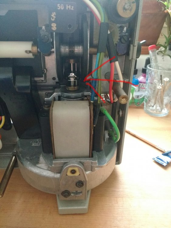 Möchte hier ein kurzes Feedback zu meiner Mark M-Untersuchung hinterlassen, falls jemand ähnliche Probleme hat fühlt er sich vl nicht so allein 😄 (und vl hilft es sogar...). Ich habe den Motor aus- und wieder eingebaut und auf einmal funktionierts einwandfrei... zumindest in sofern, dass ich nun weiß, dass diese halboffene Führung (roter Pfeil) der Motorwelle ziemlich haarsträubend locker mit einer 'Kugel' (rund ist was anderes) in die Schiene des Geschwindigkeitsregler greift. Diese Führung schliff bei mir beträchtlich je nach Stellung (was mich bei der Konstruktion auch nicht wirklich verwundert). Und das war eben bei dem eh höheren Drehmoment des 24er-Gangs zuviel des Widerstands für den Motor. Falls es bei euch also auch das Problem von nicht zu wenig, sondern zuviel Reibung an einem Eumig mit Reibrad gibt, schaut euch das Teil mal an!
