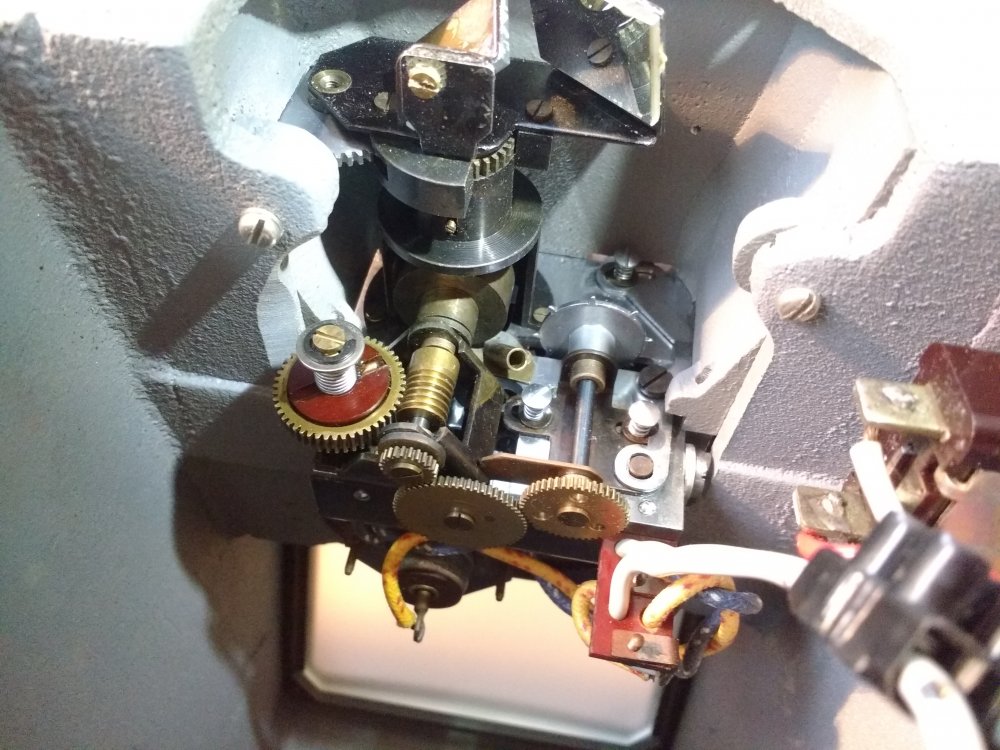 Wie ich mir gerade die Mechanik erklärte stieß ich auf zwei Unbekannte: 1. das Messing'röhrchen' neben dem Prisma, rechts oberhalb der Schnecke. Es zeigt genau aufs Bildfenster, ist zu diesem aber nicht geöffnet und hat kein Gewinde innen oder außen. 2. das Rad, das vom Schneckengetriebe angetrieben wird. Ich vermute, dass es nur eine Friktion gibt... Mag jemand miträtseln? 😉