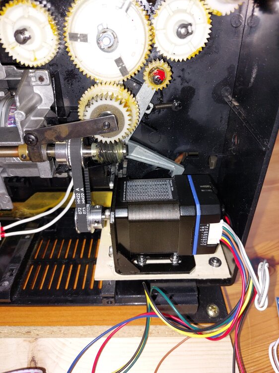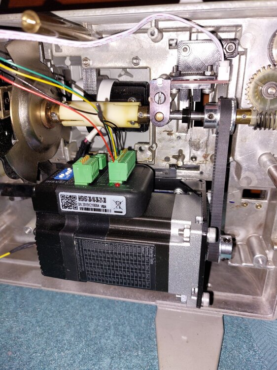Der Antrieb Da ich aus der Welt der EUMIG Projektoren komme (meine Großmutter hat damals bei EUMIG gearbeitet und mir meine erste Kamera & Projektor geschenkt) und diese Geräte damals mit Wechselstrom-Synchronmotoren angetrieben wurden, ist es mir nicht in den Sinn gekommen, dass es auch andere Geräte gibt. Erst in den letzten Jahren, wo ich auch Bauer, Yelco, ELMO und diverse andere Projektoren genauer angeschaut habe, wurde mir klar, dass es ohnehin viele Modelle mit Gleichstrommotoren gibt, die deutlich leichter in der Geschwindigkeit geregelt werden können. Ich habe aber bei diversen Tests feststellen müssen, dass diese Motoren nur bis etwa 6 FPS brauchbar funktionieren, darunter klappt das bei den Wenigsten, was wohl an der Kennlinie dieser Motoren liegt und sie im untersten Drehzalbereich kaum Kraft haben. So war es auch bei meinem Bauer Visalux und ich habe gleich mal den Originalmotor durch einen NEMA17 Stepper ersetzt. Solche Stepper habe ich von diversen anderen Bastelprojekten daheim herumliegen. Wie hier im Forum schon gefragt wurde, ober der Schlupf eines Riemenantriebes eine Rolle spielt (hängt davon ab wie der Antrieb realisiert ist) habe ich mich gleich dazu entschlossen auch einen Antrieb mit Zahnriemen einzubauen, wollte auf Nummer Sicher gehen und über Schlupf nicht nachdenken müssen, was bei diesem Projektor wirklich sehr einfach zu bewerkstelligen war. Ich verwende eine 1:1 Übersetzung, also eine Umdrehung entspricht exakt einam Bild. Ich verwende Zahnriemenscheiben wie sie auch für 3D Drucker verwendet werden, das ist also Zeugs das man heute sehr leicht kaufen kann GT2 Zahnriemenscheiben und die notwendigen Zahnriemen gibt es fein abgestuft und fast verschiedenen Längen GT2 Zahnriemen 6mm Bei meinen ersten Versuchen war es ein ganz normaler Stepper, für den man aber auch noch einen Controller braucht wie z.B. so etwas Stepper Treiber aber davon bin ich rasch wieder abgekommen. Es funktioniert zwar grundsätzlich wunderbar, weil man im unteren Drehzalbereich wirklich perfekt den Motor betreiben kann, aber (was ich bisher vergessen habe zu erwähnen) ich möchte versuchen auch eine Lösung zu finden, wo ich in Echtzeit scannen kann und das ging mit dem Stepper nicht, weil bei ca. 6 FPS das Ende der möglichen Drehzahl erreicht wurde. Ausserdem muss ich gestehen, dass mich bei meinen ersten Scan Tests dieses piepsende Geräusch des Steppers echt genervt hat. Das "Gerattere" des Projektors ist ja schon unangenehm genug, aber im Zusammenhang mit so einem Stepper ist das unerträgtlich, also musste auch hier eine andere Lösung her und so habe ich testweise in einen EUMIG Mark 8 einen Stepper Servo Motor eingebaut wie im folgenden Bild zu sehen ist und das funktioniert einfach grandios, auch wenn der iHSV57 mit seinen 100 Watt wohl "etwas" übertrieben ist, aber den hatte ich nun mal herumliegen. Auch hier wieder der entsprechende 1:1 Zahnriemanantrieb zu sehen, nur eben mit einem etwas längeren Zahnriemen. Dieser Motor ist fast nicht zu hören und kann von "Schneckentempo" also deutlich unter 1FPS bis ca. 3000 U/min betrieben werden was dann schon 50 FPS entsprechen würde. Und die Ansteuerung dieser Motoren ist wirklich einfach. Man braucht 1 Pin für die Richtung und 1 Pin für die Impulse, die am Pico sehr leicht mit PWM erzeugt werden können. So stand mein Entschluß fest und ich habe nach so einem Motor aber in NEMA 17 gesucht (der iHSV57 ist doch etwas groß) und wurde letzte Woche fündig NEMA17 Servomotor und habe ihn sofort bestellt und seit gestern werkelt er in meinem Bauer Testprojektor, wie im obigen Bild zu sehen ist und das wird wohl künftig der Motor meiner Wahl sein, weil ich damit wohl ALLE meine künftigen Experimente durchführen kann. Ich möchte aber schon erwähnen, dass dieser Aufwand mit dem Antrieb nicht wirklich notwendig ist und ich das jetzt nur deshalb mache, weil ich noch einige Experimente vorhabe und mich im Moment auf keine Kompromisse einlassen möchte 😉