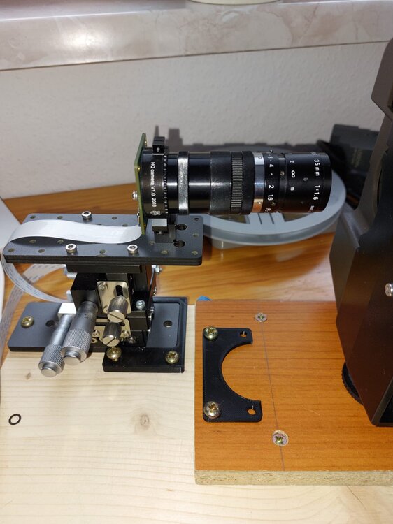 Kamera & Objektiv Als Kamera nutze ich natürlich die Raspberry HQ Kamera die ich vor dem Projektor auf einen 3-Achsen Lineartisch montiert habe. Das ist zwar zum Experimentieren recht nett, aber in der Praxis keine brauchbare Lösung, weil viel zu wackelig. Als Objektiv verwende ich ein simples C-Mount Objektiv mit 35mm 1:1,7 vor das ich noch entsprechend viele Distanzhülsen geschraubt habe. Das habe ich rein experimentell ermittelt, ich kenne mich mit Objektiven viel zu wenig aus um dazu was Schlaues sagen zu können. Die ganze Konstruktion möchte ich aber durch ein Objektiv ersetzen, wie es Friedemann in seinem Projekt beschrieben hat, das scheint mir doch eine deutlich bessere Lösung zu sein.
