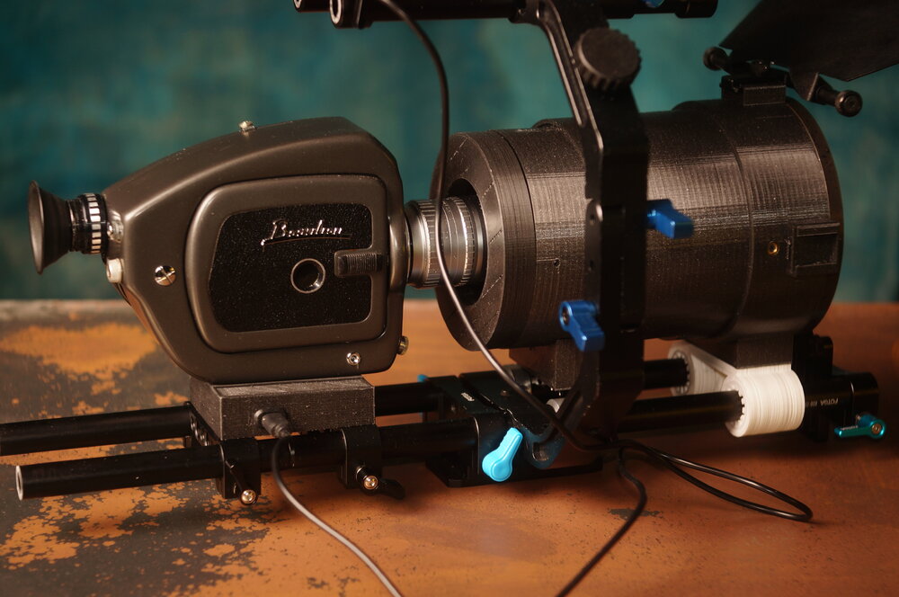 Die 2008 schaut mit einem Angenieux 25mm 1.4 durch ein NAP2 2x Projektions-Anamorphot, das ich rehoused habe, um es bis in den Nahbereich fokussieren zu können. Die Stromversorgung der 2008 über USB / Powerbank funktioniert aber unabhängig von diesem Rig. man kann die Rodclamps unten an der Basis gegen eine Platte mit Stativgewinde austauschen. Der winzige 2,4V Stepdown für den Beli befindet sich innerhalb der Basis. Die Stromversorgungs-Leiterbahnen in der Kamera waren durchgefault (Elektrolyt...), und ich musste sowieso alles neu verdrahten. -