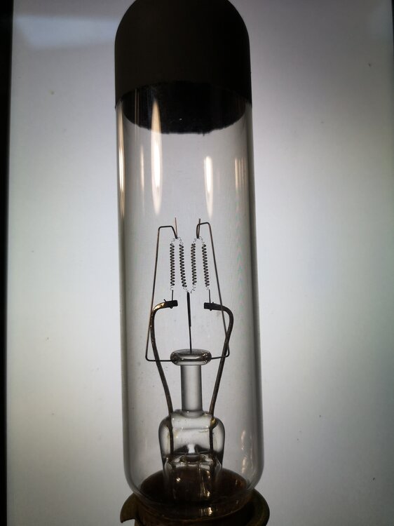 Ich bin nicht so der riesige Elektroniker und mein Multimeter scheint auch irgendwie fehlerhaft zu sein. An der Lampe messe ich allerdings exakt den gleichen Wechselstrom, wie in der herkömmlichen Steckdose. Wenn ich den Projektor mit Lampe anschalte, "zuckt" das Amperemeter, es bleibt aber auf null, auch wenn ich die Stromstärke mit dem Drehhebel erhöhe. Die Lampe bleibt vergleichsweise schummerig und gelblich. Der installierte Vorwiderstand ("210-230V, 500W") fängt an den dünneren Wendeln unten an leicht zu glühen. Wenn ich den Projektor ohne Lampe betreibe, regiert das Amperemeter folgerichtig gar nicht. Ich habe die mitgelieferte Glühlampe mal abgelichtet. Wer weiß, ob das hilft. Alle Kabelverbindungen sehen, so wie ich das beurteilen kann (also schlecht), original aus. -