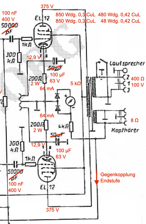 Sieht für mich jedenfalls ziemlich ungewöhnlich aus, so ein Leistungswiderstand am Rundfunkeingang ... Jetzt hat der Verstärker ja einen 100 Volt Ausgang mit 400 Ω (lt. Beschriftung und auch gerechnet), zusätzlich gibt es aber auch noch einen Kopfhöreranschluss mit 2 Bananenbuchsen auf der Front. Irgendwo habe ich mal was von 8 Ω gelesen, finde aber nicht mehr, wo ich das herhabe. Wenn ich von den Windungsverhältnissen, die auf dem Übertrager stehen, ausgehe, müsste das sogar ein 4 Ω Ausgang sein. Kann man überschlägig sagen, wie belastbar dieser Ausgang ist? Ich habe bisher eine kleine 8 Ω Monitorbox dort angeschlossen, die so einwandfrei betrieben werden kann. Natürlich habe ich darüber nicht Stundenlang bei voller Ausgangsleistung gehört. Die Drahtstärke dieser 4 Ω Wicklung entspricht der der 400 Ω Wicklung von 0,42 CuL, wobei bei 8 Ω bzw. 4 Ω der fließende Strom doch wesentlich höher ist, als bei der 100 Volt (400 Ω) Wicklung. Ist das Ok, hier eine normale Lautsprecherbox von 4 bis 8 Ω anzuschließen, ohne das man den Übertrager bzw. die Wicklung überlastet? Oder muss ich zwingend einen Leistungsstarken 100 Volt Übertrager am 100 Volt-Anschluß anschließen um die volle Leistung nutzen zu können? Hier mal die kompletten Daten zum Ausgangs-Übertrager lt. Beschriftung: Primär: 850 + 850 Windungen = 5 kΩ Raa für Gegentakt (0,3 CuL) Sekundär: 480 Windungen = 400 Ω (0,42 CuL) 48 Windungen = 4 Ω (0,42 CuL) Also ein Übertragungsfaktor von 3,54 : 1 für die 100 Volt (400 Ω) Wicklung, und eine Übertragungsfaktor von 35,4 : 1 für die 4 Ω Wicklung. Für die Impedanzen entsprechend quadratisch (12,54 : 1 und 1254 :1). Viele Grüße Wolfgang
