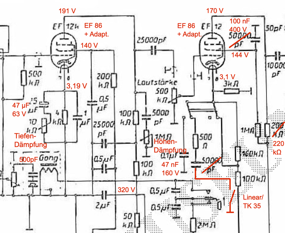 Ja stimmt Jens, du hast recht - keine RIAA-Entzerrung notwendig. Mit dem Verstärkungsfaktor erhöhen ist es aber schwierig, da die erste Stufe keine Gegenkopplung hat, die man noch vermindern könnte. Außer dem Regler für die Gonglautstärke ist auch kein Widerstand zwischen Gong und Steuergitter der ersten Röhren. Ich werde es erstmal mit einem Piezoelement versuchen, falls ich etwas brauchbares finde. Ich habe mir eben mal die Eingänge angeschaut und was mir aufgefallen ist, ist der dicke 3-4 Watt 10 kΩ Widerstand am Rundfunkeingang zwischen Kontakt 2 und 3. Wofür ist denn der so dick? Der sieht ja so aus, als würde man darüber das ganze angeschlossene Gerät mit Strom versorgen können, obwohl es hier keine Verbindung zum Netzteil gibt. Gruß Wolfgang