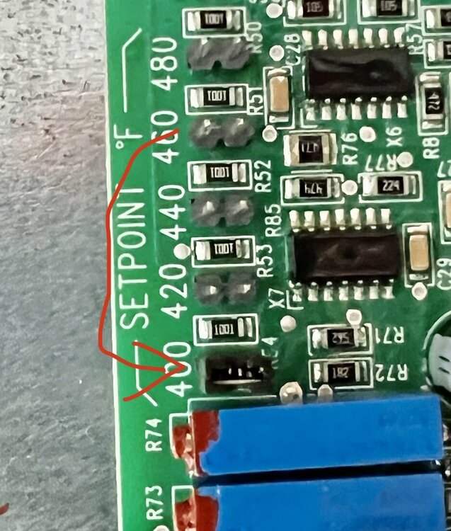 24. Problem gelöst! Haase hat einen fähigen Kundendienst und dieser hat mich telefonisch angeleitet. Die Temperatur ist total easy zu verstellen und war auf die in Amiland bevorzugten 460F eingestellt. Dort haben wir die Brücke raus und nach einigen Testdurchläufen auf 400F (geringste Temp.) eingestellt. Die Automatik ist jetzt nutzbar und auch für neues Personal ist die Maschine gut zu verstehen. Bin jetzt happy und bedanke mich für die vielen Stimmen hier. Foto der Platine:
