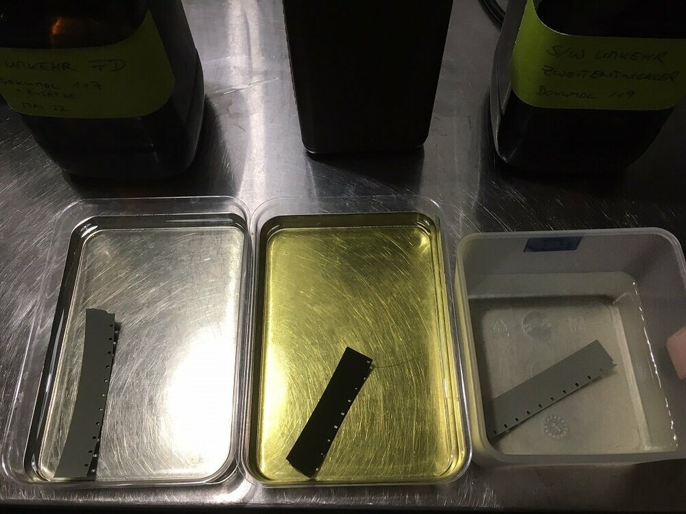 YIPPIHYAHYEAH! Ich danke Euch für Eure Hinweise. Ich habe soeben meine ersten 10cm 16mm Film äußerst zufriedenstellend entwickelt! Auf Friedemanns Hinweis hin, habe ich einen durchbelichteten und ausentwickelten Teststreifen in die Bleiche gehalten und jede Minute 4 Perfolöcher tiefer eingetaucht, um zu schauen, ab wann der Film durchgebleicht und klar ist. Bei 8 min habe ich das Ergebnis begutachtet und festgestellt, dass gar nichts richtig klar wird, sondern milchig, schlierig, gelblich. Sollte wirklich die Kaliumpermanganat-Bleiche Schuld sein? Dann könnte ich mein neues Hobby gleich wieder aufgeben, weil ich mir die Kaliumdichromat-Bleiche nicht antun möchte... Weil ich nun aber wissen wollte, ob die vor 2 Tagen angesetzte Kaliumpermanganat-Bleiche aktiv ist, habe ich einen Streifen von einem Schwarz-Weiß Papierabzug in die Bleiche gehalten, ob was passiert. Das Bild war nach ca. 1 Minute verschwunden... Also musste es was mit der Erstentwicklung zu tun haben. Das war Theseus Hinweis. Da ich die Dokumol Flasche vor einer Woche im Fachhandel gekauft hatte und der FD frisch angesetzt wurde, habe ich das eigentlich ausgeschlossen, aber wer weiß... Ich habe 3 durchbelichtete Testschnipsel, in jeweils 1 Schale mit Dokumol + Zusätze / 1 Schale mit Eukobrom 1+9 vom Papierentwickeln (ohne Zusätze. Wollte mir das für den Test nicht versauen) sowie eine Schale mit dem Zweitentwickler (Dokumol, gleiche Flasche, ohne Zusätze) gegeben und die Zeit gestoppt. Nach ca. 1 Minute sah das Ergebnis so aus: Der Streifen im Eukobrom (in der mittleren Schale) war schon tief schwarz, während die beiden in Dokumol schwimmenden Streifen erst fleckig, gräulich waren. Das Ergebis nach weiteren 5 Minuten im Entwickler sah dann so aus: Ganz links ist der Streifen aus dem Eukobrom-Bad, die anderen Beiden kommen aus dem Dokumol. Weit entfernt von Schwarz. Dann habe ich die Schnipsel in die Bleiche geworfen. Das Ergebnis war folgendes: Links ist wieder der Streifen aus dem Eukobrom. Es sind zwar alle Streifen wolkig und fleckig, was ich der fehlenden Agitation in meinen Schalen zuschreibe, aber es ist ganz klar ersichtlich: Das Dokumol scheint nicht zu funktionieren. Offenbar stand das schon seit Jahren beim Händler und ist einfach nicht mehr aktiv. Also habe ich mir ein neues Bad Eukobrom 1+7 angesetzt, diesmal mit den Zusätzen aus Friedemanns Rezeptur und einen neuen Teststreifen, diesmal in der Krasnogorsk belichtet und einer Kaiser Entwicklungsdose entwickelt. Erstentwicklungszeit war 8 Minuten, dann 7:30 Bleichbad, 1-2 min. Klärbad und beim Öffnen der Dose gesehen: Blankfilm mit ein paar hauchdünnen Bildspuren. Der Film war also komplett überentwickelt... Thermometer in den FD gehalten und festgestellt: 23,5 Grad... Blöd. Da ich hier im Büro keine Eiswürfel habe, aber unbedingt wissen wollte, ob ich denn nun auch 16mm Film entwickeln kann, habe ich noch mal einen Streifen mit geschätzten, verkürzten Zeiten entwickelt: Erstentwickler 5 min., Bleichbad 5 min. (war ja schließlich auch 23,5 Grad warm...), Klärbad 1 min. - Bei der Zwischenbelichtung konnte ich schon erahnen: Diesmal wird's was. Nach 5 Minuten Zweitentwickler und 3 Minuten fixieren sah das dann so aus: Mega! Ich bin sehr zufrieden mit dem Ergebnis, obwohl man da bestimmt noch ein wenig mit der Entwicklungszeit experimentieren kann. Auf diesem kurzen Teststreifen konnte ich auch keine Schichtablösung feststellen. Was sagen die Profis? Kann es ein, dass eine verkürzte Bleichzeit bei erhöhter Temperatur dem Fomapan 100 gut tut? Wie gesagt: Danke für Eure Hinweise. Im Juli wird der erste Kurzfilm auf 16mm gedreht 🙂 Beste Grüße, Sebastian