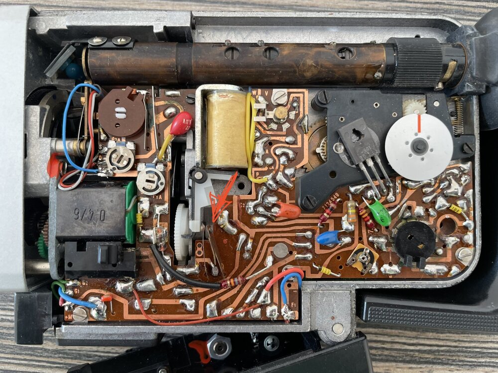 Ich habe eine Nizo 156 geschenkt bekommen, die ein wenig Hilfe benötigt. Vielleicht hat jemand von Euch eine Idee, wie ich sie wieder zum Laufen bringe. Die Kamera löst nicht aus, weder über den Zeigefinger-Schalter, noch über einen eingeschraubten Fernauslöser, und das, obwohl die Stromversorgung in Ordnung ist. Bei eingelegten Batterien und eingeschalteter Kamera läuft der Zoom-Motor problemlos und kräftig bei Bedienung der Zoom-Wippe. Ich habe die Kamera also aufgemacht und das Naheliegendste als erstes versucht: Die bereits grünlich angelaufenen Kontakte unter dem Geschwindigkeits-Regler gereinigt - was leider nichts bewirkt hat. Das Relay in der Mitte der Platine zieht beim Auslösen nicht an. Interessanterweise löst die Kamera aber bei Nutzung der Intervall-Auslöser Funktion aus - Das Relay bekommt also Strom, ebenso der Aufwickelmotor Wenn ich die beiden Blattfedern (mit einem roten Pfeil markiert) manuell kurz schließe, läuft die Kamera problemlos auf allen Geschwindigkeiten - nur eben nicht über den dafür vorgesehenen Auslöser. Ich habe den Griff bereits abgeschraubt, um dort nach Korrosion zu suchen und habe alles gereinigt, aber selbst, wenn ich den Kontakt, den der Schalter bedient, durch Überbrückung schließe, tut sich nichts. Hat jemand noch eine Idee, wo auf dem Weg vom Auslöser bis zum Relay der Fehler liegen könnte? Viele Grüße, Sebastian