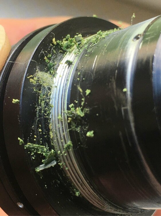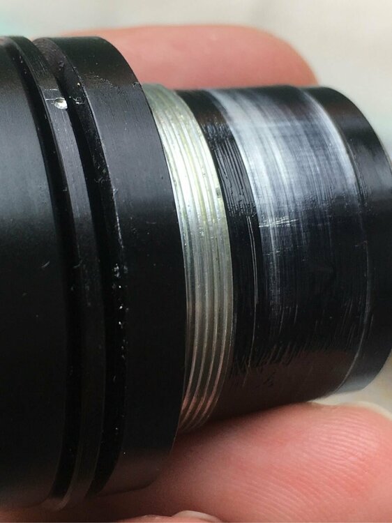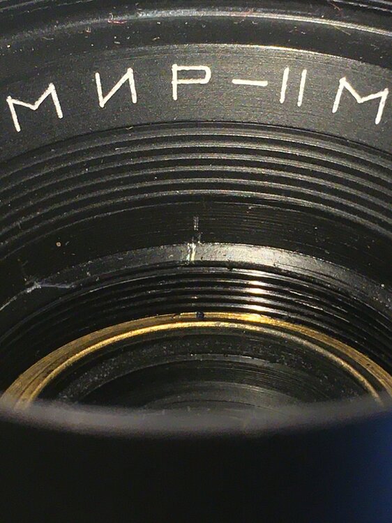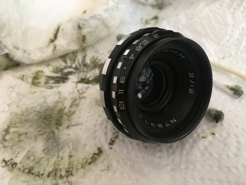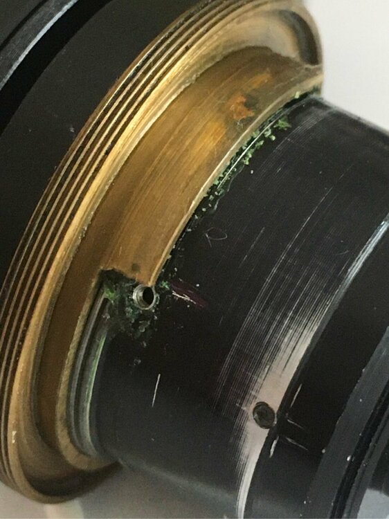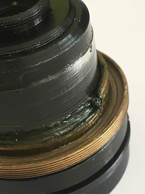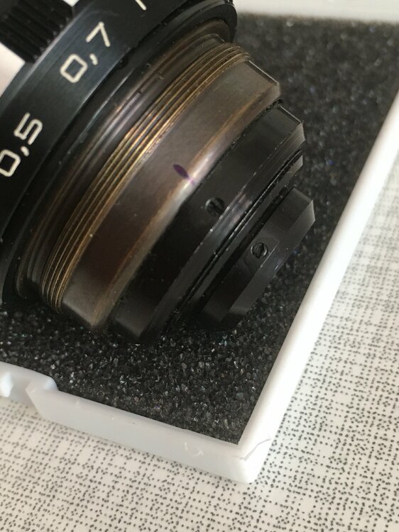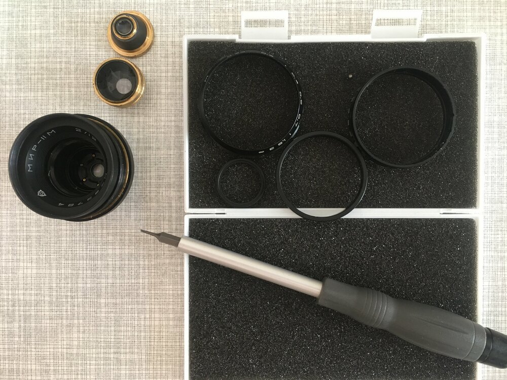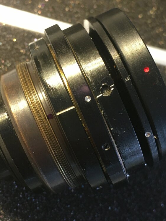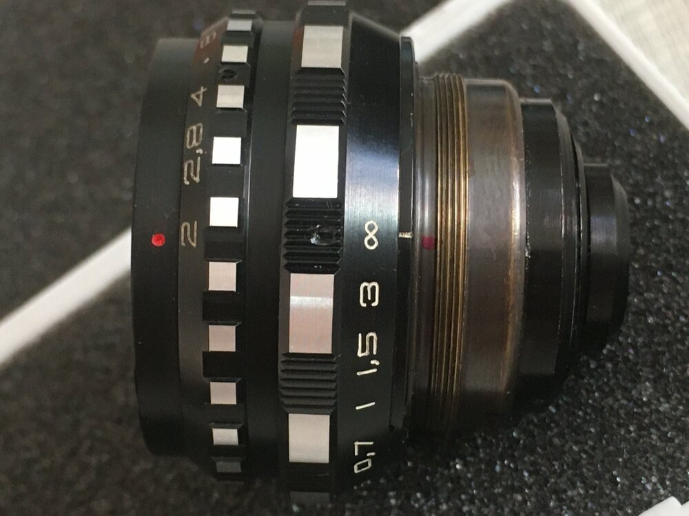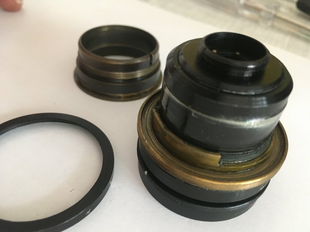 So, wie versprochen, hier eine bebilderte Anleitung für die Wartung und Reinigung der Kiev 16 Objektive. ich mache das nur mal am Beispiel des 12mm Objektivs. Die anderen beiden Objektive sind sehr ähnlich aufgebaut, und wer das kleinste Objektiv schafft, der schafft auch die anderen Beiden. Bei allen 3 Objektiven war der Focus äußerst schwergängig und ließ sich nur mit einiger Kraftanstrengung bewegen. Da die Objektive relativ klein sind und ziemlich eng zusammen stehen auf dem Objektivrevolver, hat man eigentlich während der Aufnahme nur die Chance, mit Daumen und Zeigefinger am Focus zu drehen. Ziel der Überholung war, dass der Fokus wieder ohne Kraftanstrengung bewegt werden kann. Kurz vorweg: da ich überhaupt nicht wusste, wie die Objektive aufgebaut sind und wie man an das Fokusgetriebe herankommt, habe ich alles auseinander genommen, was möglich war. Auch die Linsenelemente. Im Nachhinein gesehen war das gar nicht nötig, man kommt auch ohne das Auseinandernehmen der Linsen an den Fokus. Falls jemand die Linsen von Innen reinigen muss / möchte, erwähne ich die Schritte trotzdem, setze sie aber in Klammern. Wer nicht zwingend an die Glaselemente ran muss, dem würde ich auch davon abraten. Die Objektive sind zwar sehr einfach aufgebaut und man bekommt sie auch problemlos wieder funktionierend zusammen, aber bis ich das staubfrei hinbekommen habe, hat es ne Stunde extra gedauert… Los gehts: 1. Bevor man einen Schraubendreher in die Hand nimmt, sollte man erst mal alle wichtigen Positionen am Objektiv markieren, damit man im Zweifelsfall alles wieder richtig zusammen bekommt. Dazu habe ich den Fokus auf unendlich und die Blende auf 2 gestellt. Das sind die jeweiligen Endanschläge. Dann mit einem Permanent-Marker diese Stellung auf dem Messing über dem Gewinde markieren, damit am Ende alle Elemente wieder genau so sitzen wie vor dem Zerlegen. 2. Die winzigen Schrauben vom Fucus- und Blendenring lösen. Man muss sie nicht ganz rausschrauben, sondern lediglich ein paar Umdrehungen. Das minimiert das Risiko, die winzigen Schrauben zu verlieren. Focus und Blendenring vorsichtig nach vorne, bzw. hinten abziehen und sogleich die Stellung aller Ringe wieder markieren. In diesem Fall habe ich einen dünnen Kratzer in den Lack geritzt, weil ich Sorge hatte, Permanentmarker beim Reinigen vielleicht mit zu entfernen. Vorsicht mit der Kugel unter dem Blendenring, dass die sich nicht verabschiedet (es sei denn, Ihr wollt Eure Blende eh „de-clicken“). Am besten mit einem magnetischen Schraubendreher herausnehmen und das Loch säubern. Anschließend beim Ring, der sich unter dem Fucusring befand (der letzte vor dem Gewinde, mit dem weißen Strich drauf) die 3 Schrauben leicht lösen und den Ring nach hinten herunterziehen. [3. Optional: Linsen entfernen / kann übersprungen werden] Die Stellung der hinteren Linse markieren. Als Marke habe ich die beiden Schrauben genommen. Die Hintere Schraube lösen, den Ring abnehmen und die beiden Linsen herausnehmen. Achtung, die Reihenfolge der Linsen nicht durcheinander bringen beim Zusammenbau. Vor dem Herausnehmen der vorderen Linsen unbedingt die Position des Halteringes am Gehäuse markieren. Der Haltering hält alle drei Linsen gemeinsam im vordern Teil fest und muss am Ende wieder genau an der gleichen Stelle sitzen! Die Linsen haben im Tubus sehr wenig Spiel und verkanten sich beim Wiedereinsetzen leicht, so dass man beim Aufschrauben und Festziehen des Halteringes denken könnte, alles sitzt wieder richtig, obwohl man den Ring nur gegen ein verkantetes Linsenelement drückt. Die Markierung hilft dabei, zu erkennen, ob wirklich wieder alle Linsen am richtigen Platz sitzen. Den Haltering lösen (Vorsicht, nicht abrutschen…) und das Objektiv vorsichtig nach vorne kippen, damit die Linsenelemente langsam herausrutschen. Alle Glaselemente sind in Messinghülsen eingefasst. Es kann eigentlich nicht viel passieren…) Auch hier wieder: Reihenfolge merken. So müsste das jetzt bei Euch aussehen: 4. Nun noch den letzten schwarzen Überwurfring entfernen. Der ist zwar nur mit einem kleinen Schräubchen gesichert, aber die eigentliche Sicherung besteht aus 50 Jahre altem, hartem Fett. Kurz: Das Ding herunterzubekommen war ein Akt und ging nur mit dem Einsatz von Reinigungsbenzin und sanfter Gewalt. Wenn man von hinten auf das Objektiv schaut, muss der Ring GEGEN die Uhrzeigerrichtung abgeschraubt werden. 5. Bei der Fokussierung ändert sich nur die Position der beiden hinteren Linsen. Der hintere Tubus fährt dafür minimal rein und raus. Die Position des Tubus wird mit einer kleinen Madenschraube fixiert, die in einem kleinen Gang läuft. Ich habe mir die Position dieses Ganges und die Position, die der Tubus bei Unendlich-Stellung hat markiert. 6. Wenn man den Überwurfring aus Punkt 4 abbekommen hat und man die Madenschraube herausnimmt, kann man den hinteren Messingtubus abnehmen. 7. Was jetzt noch bleibt, ist die kleine Schraube, die den Endanschlag des Focus blockiert, herauszuschrauben. Dann kann man den letzten Messingring abschrauben und sich wundern, wie hart Fett werden kann… Ich habe die Kruste mit einem Plastikspatel abgekratzt, und anschließend alle Teile gesäubert, entfettet und neu gefettet, sowohl die Gewinde, als auch die inneren Laufflächen des Messing-Tubus. 8. Zusammenbau in umgekehrter Reihenfolge. Die ganzen Markierungen, die ich gemacht habe, haben mir die Sicherheit gegeben, dass alles wieder so sitzt, wie vorgesehen. Wichtig ist beim festziehen der Schräubchen, dass man nicht eine nach der anderen festzieht, sondern ringsum jeweils nur ein paar Umdrehungen, also Schraube 1 ein wenig, dann Schraube 2 ein wenig und ebenso die 3. Dann wieder Schraube 1 ein wenig, usw. Wenn man das nicht beachtet, werden die Ringe schief sitzen und oder wackeln. Fertig: -