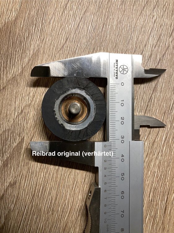 Da hier ja viele den Projektor ELMO SP-F im Einsatz haben und auch häufig über das defekte Reibrad klagen, was aufgrund des ausgehärteten Gummis oft zu ungleichmäßigem Projektorlauf führen kann, möchte ich gerne meine Lösung zur Reparatur des Reibrades hier teilen: Das defekte Reibrad kann schnell und einfach ohne weitere Hilfsmittel per Hand vom Kern (Welle mit Riemenscheibe) getrennt werden. Als Ersatz für den Gummi habe ich in meinem Fall einen speziellen O-Ring (21x6, NBR70, gratfrei und geringe Fertigungstolerenzen aus dem Zubehör für Kugellager) einfach auf den umlaufend geriffelten Kern aufgeschoben. Der O-Ring ist zwar rund im Querschnitt, läuft aber trotzdem anstandslos. Eine Verklebung ist nicht erforderlich. Der O-Ring ist 1 mm kleiner als der Aussendurchmesser des Reibradkerns. Durch den strammen Sitz des O-Rings auf der Riffelung sitz das perfekt. Das ganze ist komplett ohne Werkzeug machbar, lediglich das Reibrad muss ausgebaut werden. Das ist aber mit lösen von einer Schrauben und einem Sicherungsring auf der Welle getan. Ich habe das nun einige Wochen so laufen und keinen Abrieb des O-Rings feststellen können. Ich habe das so in meinem ELMO SP-HI Deluxe umgesetzt. Er läuft wieder super stabil. Auch der Schnelltransport läuft einwandfrei. Und es funktioniert sogar im ESS-Modus (ELMO Synchro Sound mittels Impulssteuerung) stabil ! Kosten: ca. 3,50€ Materialpreis. Hier einige Bilder und ein kurzes Video mit dem neuen Reibrad. Der ELMO -SP-F ist ja im Grunde ein solides, helles Multiformatgerät und als Deluxe-Variante mit dem ESS ideal für die synchrone Zweibandvertonung mit dem Computer ohne weitere Zusatzgeräte für N8 und S8. Gruß Frank Reibrad ELMO SP-F- NEU.mov