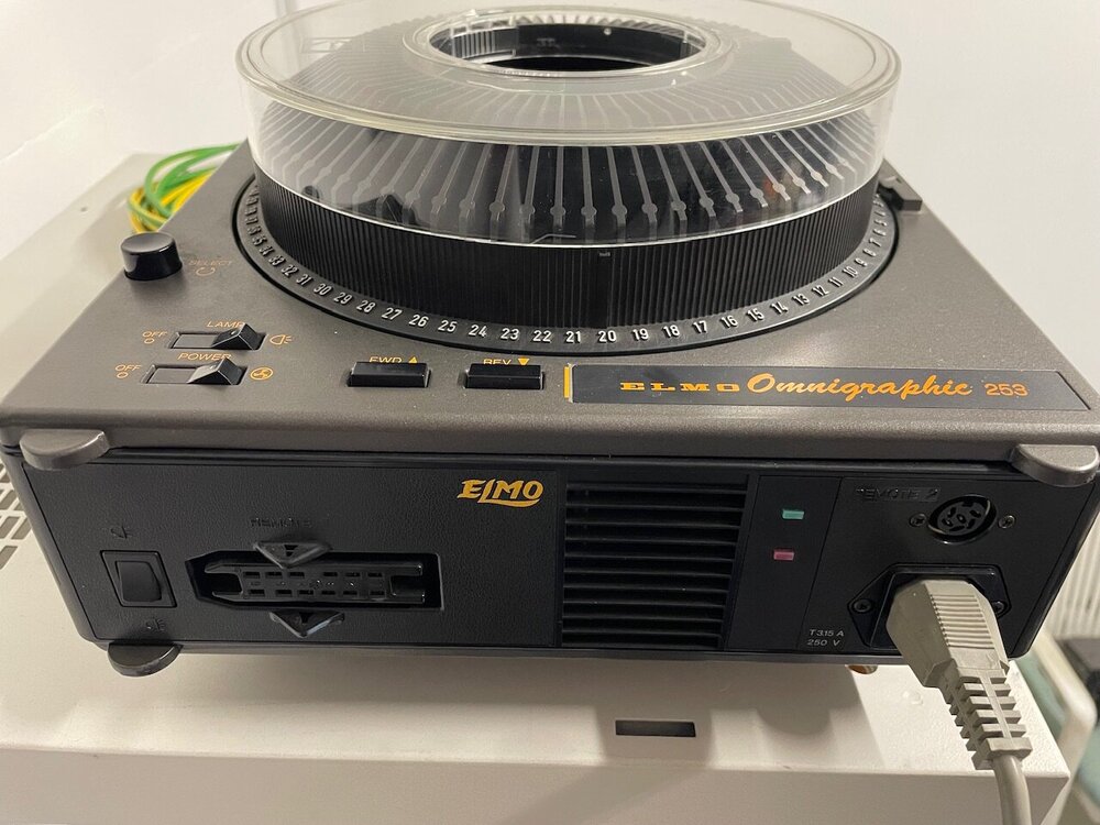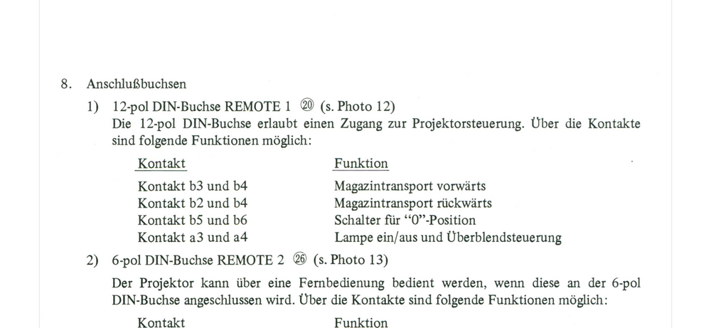 Hallo zusammen, habe hier einen schönen Karussell Diaprojektor stehen und habe mich heute mal an die Verkabelung und Installation gemacht. Auf der Rückseite gibt es neben einem 6-poligen Anschluss für eine Handfernbedienung auch eine 12-polige Buchse mit einem erweiterten Zugang zur Projektorsteuerung. Habe über die 12-poligen DIN-Buchse die Funktionen Magazin vor und zurück und Lampe an/aus probiert und alles funktionierte einwandfrei. Bis auf die Funktion “Schalter für 0-Position”, da tut sich einfach gar nichts… Jetzt muss ich gestehen, dass ich aber auch keine Ahnung habe, was das genau für eine Funktion ist bzw. wie der Projektor bei der Ansteuerung mit diesem Befehl reagieren müsste. Soll sich das Karussell evtl, automatisch zurück auf die Magazin Position 0 drehen? Eine solche Funktion gibt es zumindest nicht als Taste am Gerät, während es für Magazin vor/zurück und Lampe an/aus auch Schalter am Gehäuse gibt. Wäre toll, wenn mir jemand irgendeinen Tipp dazu geben könnte. Die Anleitung sagt leider nichts weiter dazu. Was noch komisch war, war dass ein selbstgebautes Schuko-Stromkabel dabei ist, bei dem L und N auf die beiden Pole der unklaren Funktion gelegt sind. Wer auch immer zur Hölle so ein Kabel baut, ich stecke es auf jeden Fall nicht rein 😬 Für die Auslösung der anderen Funktionen über die DIN-Buchse sind keine externen Stromquellen nötig, sondern lediglich eine Verbindung der jeweiligen Pole mit einem Knopf oder Kippschalter. In Bezug auf die Funktion “Schalter für 0-Position” glaube ich kaum, dass die einen 240V Impuls benötigt 😅 Vielen Dank für alle Tipps und Hinweise, Cornel