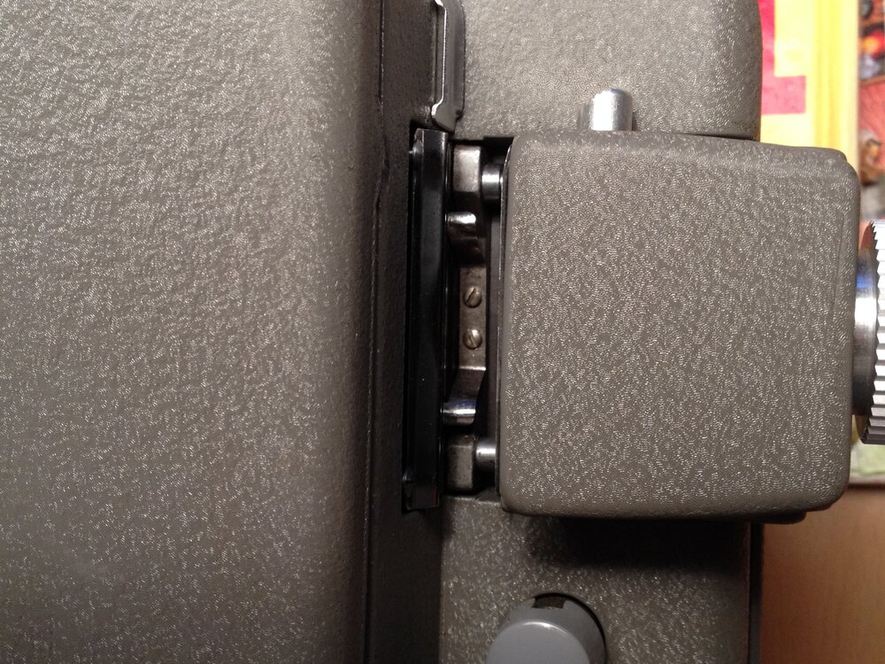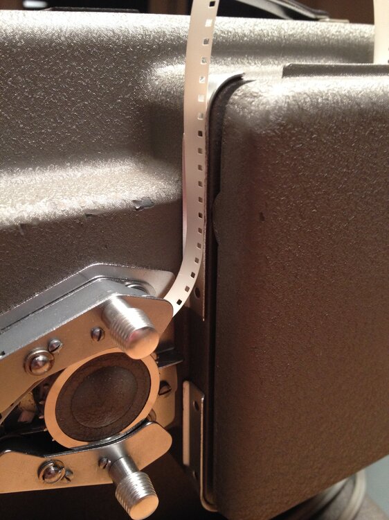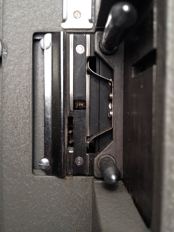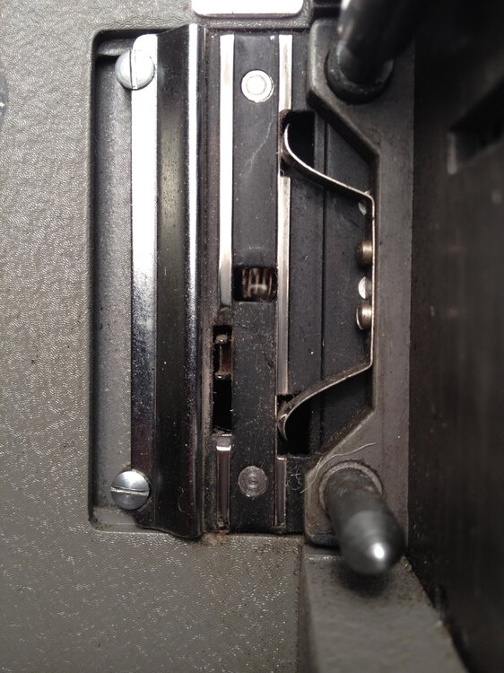 Vorstellung und Frage zu Agfa Movector F8Nico Kiefer antwortete auf Nico Kiefer's Thema in Schmalfilm Aber obwohl die Schienenkanten anscheinend mal Gewalteinwirkung erlebt haben, habe ich keine Sorgen, da der Film nicht auf der Beschädigung läuft Zudem liegt er nur mit seinem Rand auf, da die Keile der Schiene enger zusammenstehen, als der Film breit ist. Wenn es nicht so aufwändig wäre, würde ich die Schienen vom Schlachtprojektor nehmen, aber sie sind mit dem Gehäuse vernietet.