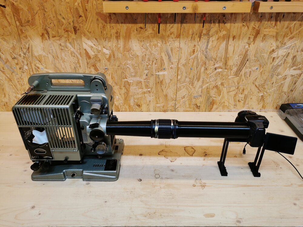 So mal wieder ein Update. Inzwischen die Optik angepasst. Objektiv ist jetzt ein Rogonar-S 4.5 mit 75mm. 3d gedruckte Adapter wurden angepasst, dass wieder formatfüllend abfotografiert werden kann. Das funktioniert sehr gut und ist jetzt auch sehr scharf bis in die Ecken. Objektiv mit Blende 8 am schärfsten. Bin auch mit Ergebnis des Scans sehr zufrieden. Nun kommt das ABER. Sobald dunkle Bildbereiche kommen, säuft das Bild ab. Wenn der Film mit einem Bauer P6 abgespielt wird sind diese betroffenen Bereiche viel heller und gut ausbelichtet. Bei 90 bis 95 % des Films passt die Belichtung und ich kann mit dem 5 Watt LED COP Leuchtmittel und einer Belichtungszeit von 1/50 oder 1/100 und EV arbeiten. Der Projektor hat ja ein 250 Watt Leuchtmittel. Würde in LED um die 40 Watt bedeuten um den gleichen Lichtstrom zu erhalten. Hab mal testweise eine 24 Watt Power LED von Cree genommen, aber da bekomme ich natürlich banding aufgrund des EV´s und kürzerer Belichtungszeiten. Die Durchleuchtung der dunkleren Bereiche wäre damit aber besser. Mechanischer Verschluss würde das banding vermeiden kommt aber aufgrund der dann geringen Lebensdauer der Kamera nicht in Frage. Wie sind da eure Erfahrungen ?