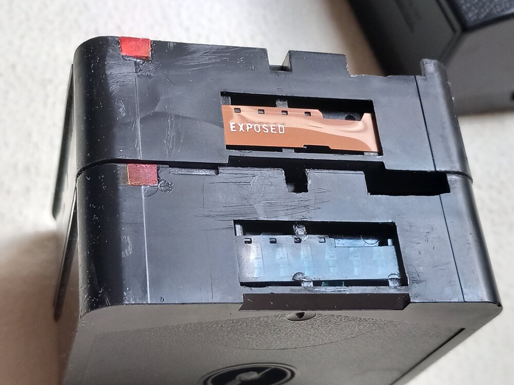 Hier die Auflösung: Die obere Kassette zeigt natürlich das normale Filmende, dadurch erkennt die Kamera wegen der Einbuchtung unten dass der Film zu Ende ist. Unten wurde ein Stück Film von mir eingeklebt. Der Greifer arbeitet in der Aussparung, so dass beliebig lange "gefilmt" werden kann. Unten keine Aussparung, so dass die Kamera anzeigt, dass Film vorhanden ist. Bei manchen Kameras läuft nur mit der unteren Kassette das Filmzählwerk.