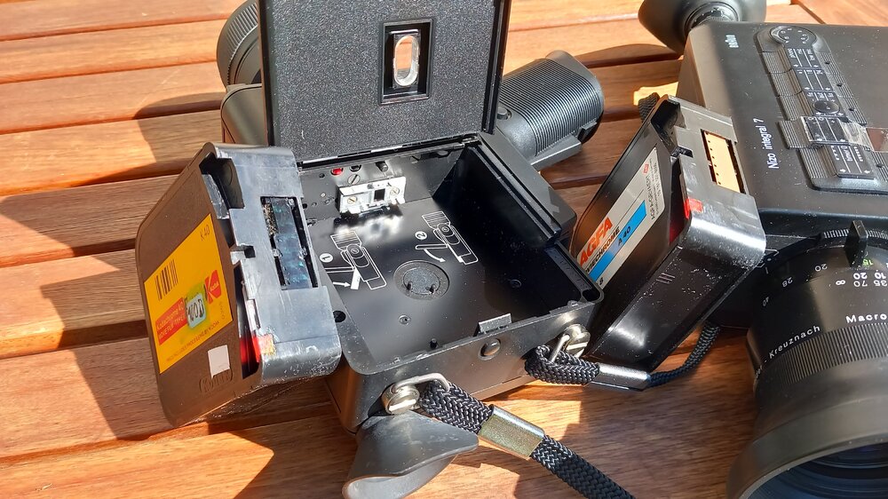 Bei dem Wetter kommen XL Kaneras mit E100 fast an ihre Grenzen. So zeigt die Eumig 128 XL Blende 16 bis 22. Da bietet sich die Integral 7 zum Vergleich an und. die zeigt erfreulicherweise die gleichen Werte. Natürlich wurden beide mit E100 Dummies geladen und der 18er Gang gewählt. Da traue ich mir zu bei beiden Kameras einen noch gut funktionierenden Beli zu diagnostizieren🙂