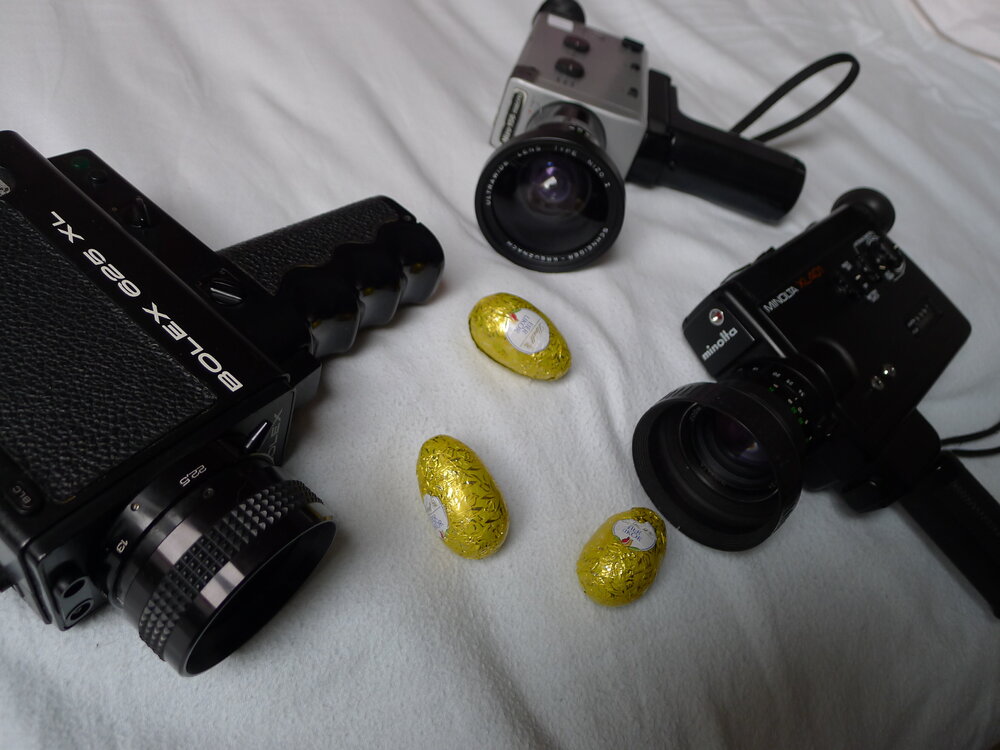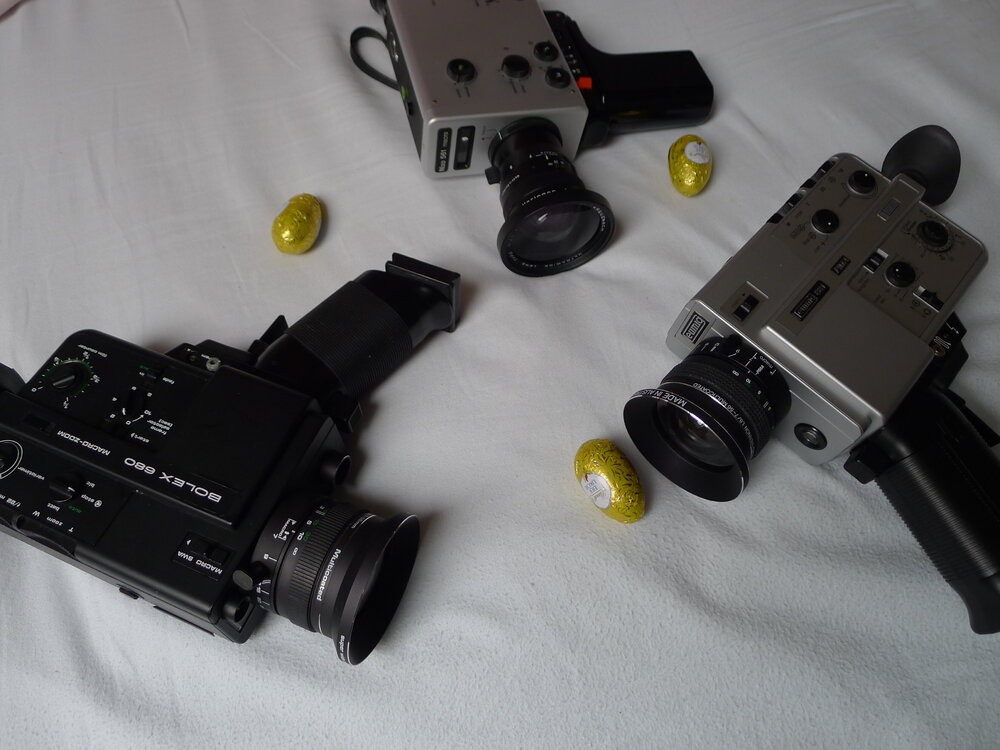 Hier noch ein Nebeneffekt der ganzen Aktion: Beifang. Schöne Taschen, Filter, Sonnenblenden und Originalverpackte Filme mit Entwicklungsgutschein. Da lebte eine ganze Industrie davon. Heute zückt der Amateurfilmer nur noch sein Handy. Ton?XL? Alles kein Thema mehr.