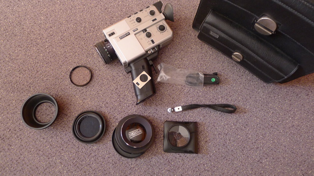 Hier noch die gesamte Beute😉, zu sehen sind die Kamera Eumig 881 PMA, Filterschlüssel, Bereitschaftstasche, Kabelfernauslöser, Handschlaufe, Trickblende, Weitwinkelvorsatz, Graufilter 4X, Objektivdeckel, Sonnenblende und Skylightfilter KR1,5.