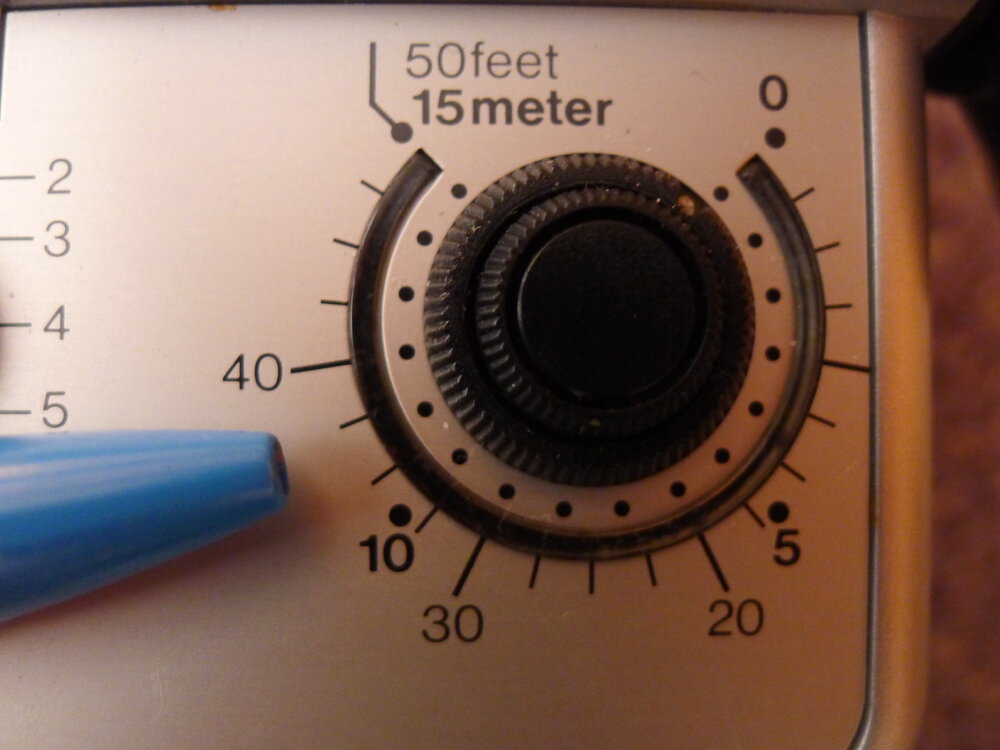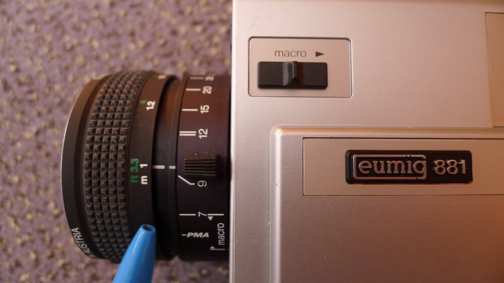 Für Interessierte stelle jetzt noch ein paar Austattungsdetails vor: Entfernungseinstellung ab 1 Meter. Für Macro mus der Sperrschieber oben nach rechts gedrückt werden.