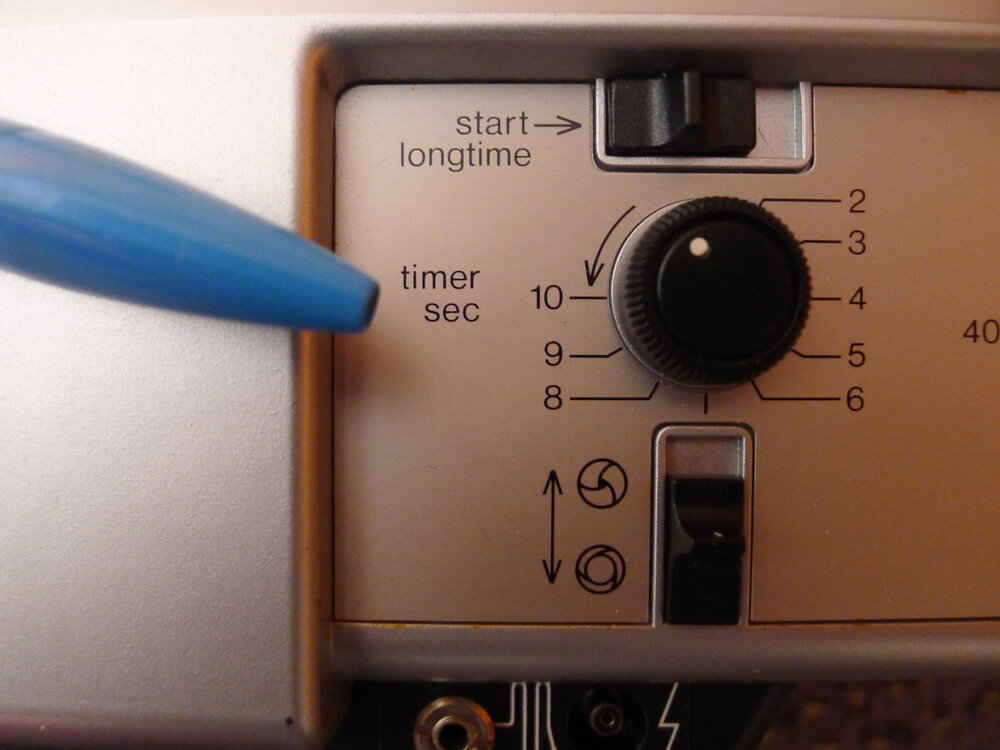 Hier sieht man die Szenenlängenvorwahl. Mittels Drehknopf kann zwischen 1 bis 10 sec. vorgewählt werden. wenn man den oberen Schieber betätigt läuft die Kamera die gewählte Zeit und stoppt dann. Der untere Schieber ist für autom. Abblendung.