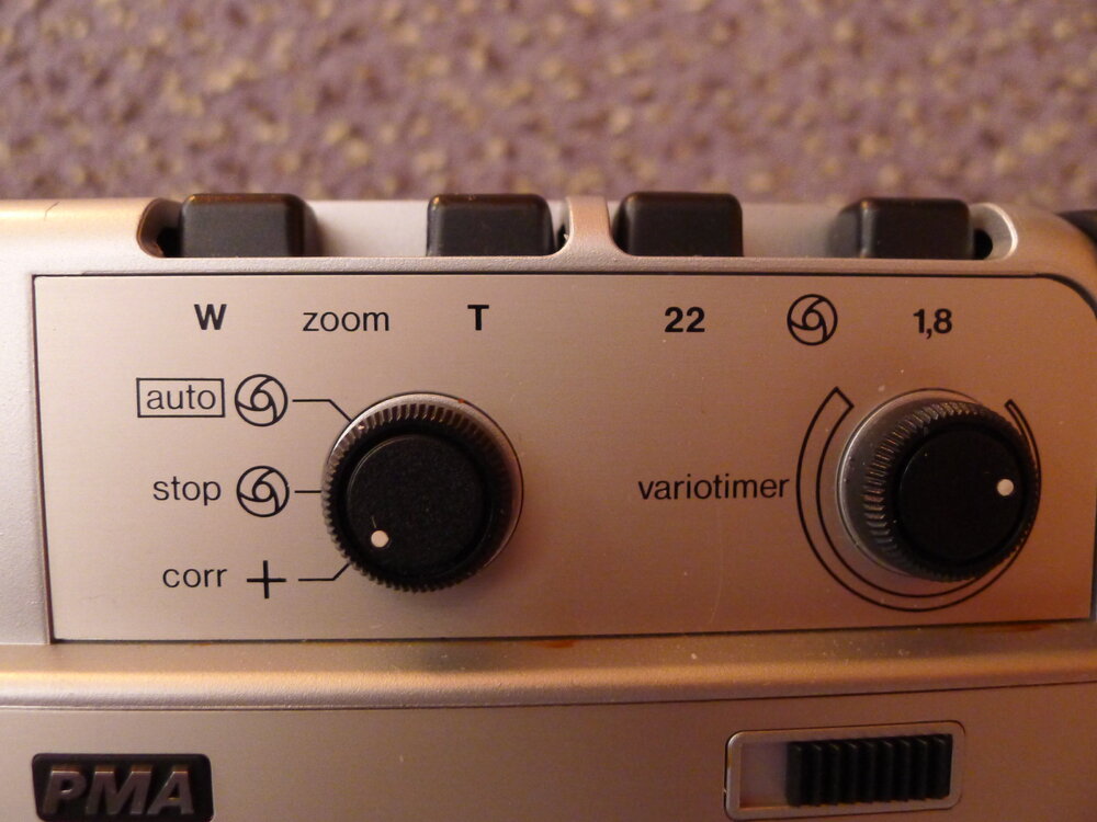 Links die Zoomtasten (zweistufig) und rechts zwei Tasten für manuelle Blendenansteuerung. Der linke Drehknopf steuert die Blende, oben mit Automatik. Dreht man nach links wird der Blendenwert gespeichert, kann aber mit den beiden Tasten verändert werden. Unten wieder Belichtungsautomatik, jedoch + eine Blende, für Gegenlicht usw.