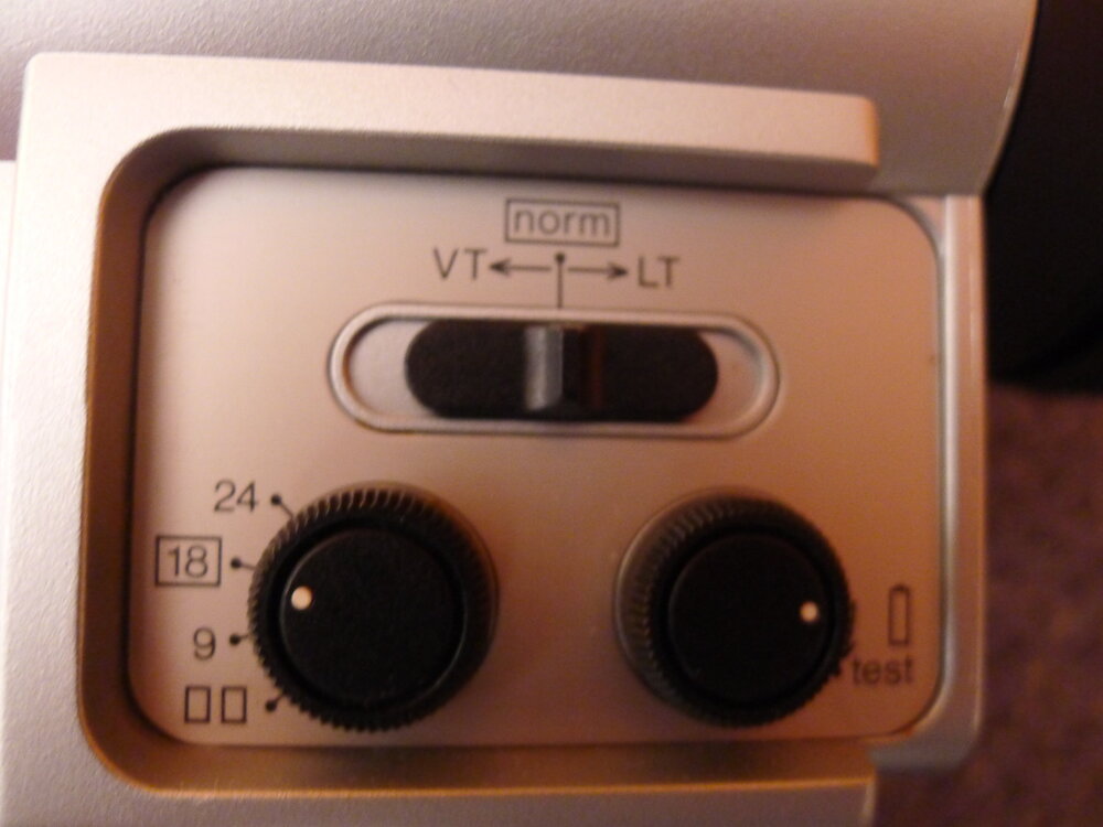 auf der Rückseite können die Laufgeschwindigkeiten und Einzelbild gewählt werden. Der Schieber oben ist in Mittelstellung für normalen Filmbetrieb. Nach links geschoben laufen Einzelbilder nach Wahl des Intervalltimer. Nach rechts geschoben starten Langzeitbelichtungen (für Nachtaufnahmen). Die Länge der Belichtungszeit steuert ein externer Sensor unter dem Objektiv.