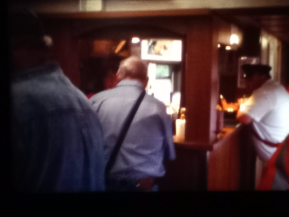Von der Leinwand mit Handy abfotografiert: eine Aufnahme im Freien und eine im Speisewagen, mit der Sankyo gefilmt ( jemand hatte gefragt ob die Sankyo den E100D richtig belichtet.