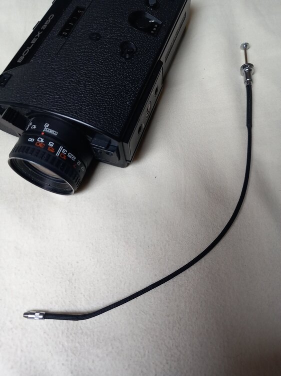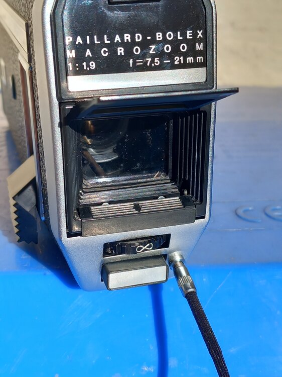 Bei der Bolex ist es auch noch so: Einzelbild kann nur mit dem Drahtauslöser ausgelöst werden. Darunter eingeschraubt, kann statt mit dem normalen Auslöser gefilmt werden. Wenn man den Drahtauslöser fixiert, hat man Dauerlauf. Auf dem Bild wurde er da eingeschraubt, wo sich der Blendenwert speichern lässt.