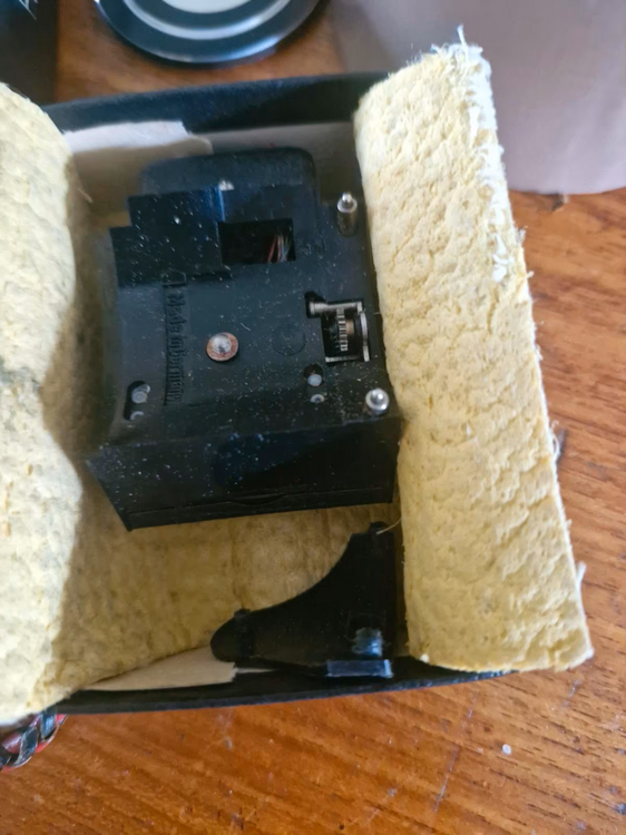 "Geschafft......" Nach zwei Gläschen Wein und viel geduldigem Hin und Her und ausprobieren sämtlicher Möglichkeiten und Kombinationen der Stellungen des Suchers und des Revolvers, hat sich eine Möglichkeit ergeben, die Überwurf-Rändelschraube vorsichtig mit einer Mini-Rohrzange zu fassen und zumindest'anzulösen'. Der Rest war dann ein Kinderspiel. mit originalem Schlüssel entfällt diese Prozedur (leider auch der Wein.....). Ich werde mir auf jeden Fall einen passenden Ersatz-Hakenschlüssel besorgen. bei diesem Objektiv macht der Revolver überhaupt keinen Sinn. deshalb bleibt die Verriegelungsschraube erstmal drin. Man kann jetzt auch schön sehen, wozu die 'Zweilochmutter mit Außengewinde' dient (dies war übrigens mal eine meiner ersten Anfrage in diesem Forum. Der originale Hakenschlüssel zum Objektiv passt auch hier natürlich wunderbar. Hier tut's allerdings auch ein Stirnlochschlüssel oder Sprenringzange. Im 3. Bild ist die alte Batterie aus dem kleinen Motor des Schneider Vario zusehen. Hergestellt in England. Etwas angerostet, glücklicherweise nicht ausgelaufen. Das Batteriefach sieht sauber aus. Als 'Neue' kommt eine'N' mit 1,5 V in Frage(ca. 30mm Länge). Wird selten gebraucht, ist aber handelsüblich und schon bestellt. Ich werde berichten.