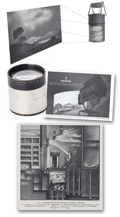 "Bühnenprojektion" Erwähnung um 1930 - was ist damit gemeint?simple.joy antwortete auf simple.joy's Thema in Nostalgie Vielen Dank. Ein Bild konnte ich auf alle Fälle sehen. Das was ich mit den bisherigen Hinweisen finden konnte, hat mir auf alle Fälle sehr geholfen mal einen groben Überblick zu bekommen. Neben den Wolkenapparaten und Anlagen für Ähnliche Effekte wurden tatsächlich auch bereits sehr früh Projektoren für Bühnenbilder angeboten. In aufwändigeren Theaterhäusern wurden teils scheinbar mehrere dieser Geräte in Kombination verwendet, Hier eine kleine Übersicht: Ob das gezeigte Emil Busch Glaukar 15 cm wirklich für diesen Zweck (Verwendung auf Bühnenbildwerfer) gebaut wurde, ist natürlich nicht bekannt. Aber ich glaube es ist zumindest denkbar.