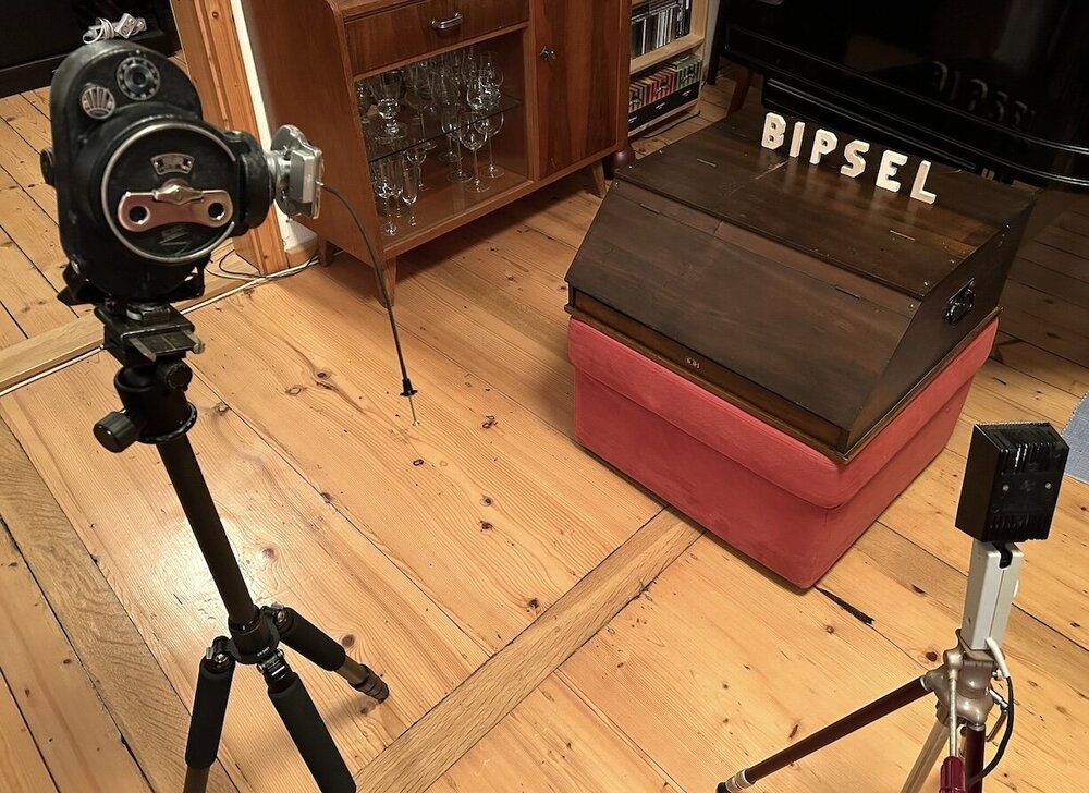 Nachdem ich beim vergnüglichen Lesen der „Filmo Topics“ (vom Februar 1931) auf dieses Zubehör gestossen bin, wurde ich wieder schwach und habe eines mit fast vollständigem Buchstaben-und Zahleninhalt erstanden (192 von 199). Ich nutze es jetzt mit meinen Filmo 70, welche einen „Critical Focuser“ besitzen. Ich schraube sie mit dem „Focusing Aligment Gauge“ auf ein Stativ, denn damit lässt sich dann Schärfe und Bildausschnitt auch ohne Reflexsucher genau einstellen. Eine alte Fotolampe sorgt für die Ausleuchtung. Am Objektiv habe ich ein kleines Kompendium zum Auf-und Abblenden angebracht. Es heißt „Bolsey Cine Fader“, funktioniert mit Federwerk und hat vier verschiedene Blendenformen. Je weiter man es vom Objektiv weg befestigt, desto schärfer sieht man die Blendenformen auf dem Film abgebildet. Beim Filmen von Titeln benutze ich daran einen Drahtauslöser, damit ich die Kamera mit der anderen Hand starten/stoppen kann. IMG_0223.mov Hier nun mein erster mit dieser Kombination erstellte kurzer Filmtitel. Die Auflösung der hier gezeigten Filme ist gering, damit ich sie hier hochladen kann, aber für einen Eindruck muss es reichen. Die schwarzen Flecken, welche in der Mitte des Clips kurz erscheinen, kommen von meinem zu großzügigen Ölen der Umlaufblende. Das abgeschleuderte Öl ist zum Glück nur im Verlaufe der ersten Szene zu sehen. Man lernt wirklich nie aus! Neues Projekt 3a.mov Irgendwann werde ich mich mal an Tricktitel heranwagen, welche mit doppelt perforiertem Film und diesen Buchstaben schön herzustellen sind. In den genannten „Filmo Topics“ sind schöne Inspirationen zu finden…