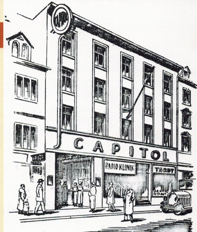 Liebe Freunde, die Zeichnung zeigt das "Schmuckkästchen von Mainz", das Capitol, kurz nach seiner Eröffnung 1933. Es ist das älteste Filmtheater von Mainz, nachdem es den allgemeinen Bombenterror als einziges heil überstanden hat. Kann jemand zum Kino etwas erzählen, vielleicht sogar Bilder beitragen? Selbst in den einschlägigen Archiven (z.B. Allgemeine Zeitung Mainz und Stadtarchiv ist außer Programm-Annocen und Filmkritiken zum Kino selbst so gut wie nichts zu finden. In meinem geplanten Buch möchte ich dem altehrwürdigen Kino meine Referenz erweisen. Ich würde mich sehr freuen, wenn ich von Euch sachkundige Informationen bekäme. Euch Herzlichen Dank vorab Viele Grüße Gerd