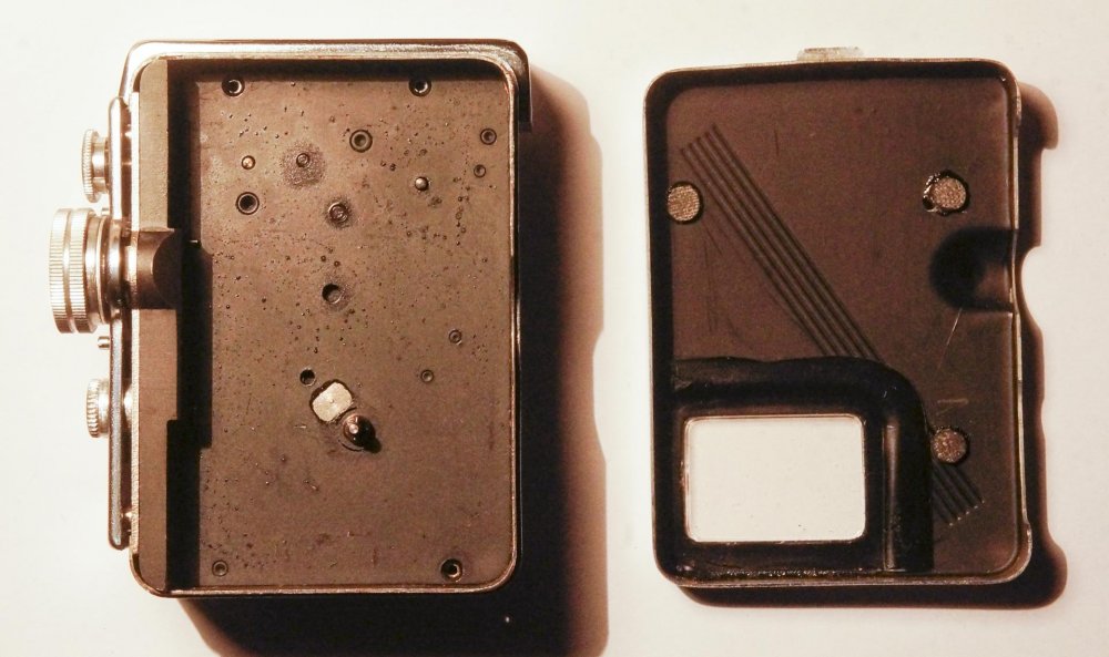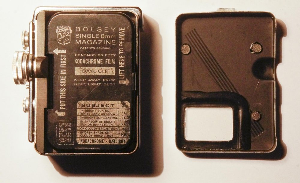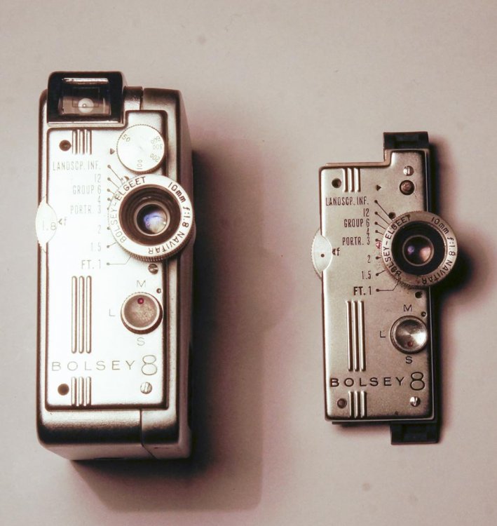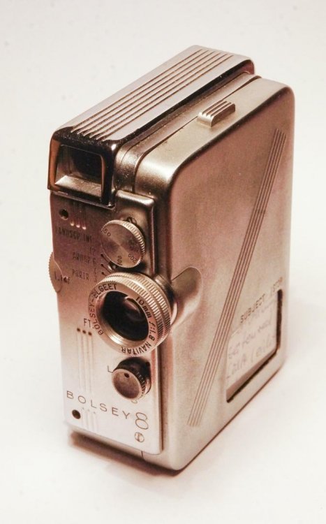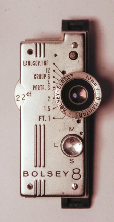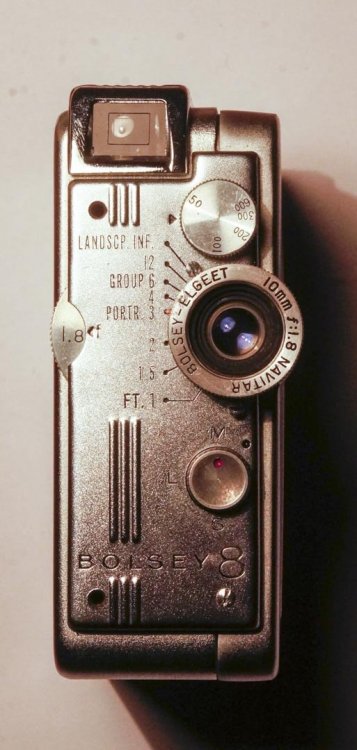 Vor langem hab ich mal eine Bolsey 8 auf Ebay in USA ersteigert. Sie ist auch "Made in U.S.A.". Als ich sie bekam war noch eine zusätzliche Frontplatte incl. Objektiv und Mechanik dabei. Dafür fehlen zwei Schrauben in der Frontplatte und die Andruckplatte in der Kassette. Es gibt bei den Bolsey 8 Kameras kleine Detailunterschiede. Vielleicht gibt´s hier im Forum jemanden der mir näheres zu meiner Kamera sagen kann. Vor allem, wann sie gebaut wurde, würde mich interessieren. Unterschiede zu anderen Bolseys: - Gravierte Zahlen am Belichtungszeitenrädchen - Gravierte Schrift am Objektiv - Schmale "8" in Modellbezeichnung auf Frontplatte - kleine, schwarze Pfeile zur Anzeige von eingestellter Blende und Belichtungszeit, statt großer, roter Pfeile - kein Wappen auf linker Kameraseite Vielleicht hat auch jemand eine intakte Filmkassette und kann mir Bilder vom Inneren schicken. Vor allem die Andruckplatte würde mich interessieren. Vielleicht kann ich mir eine nachbauen, so daß ich die Kamera einmal ausprobieren kann. Vielen Dank schon mal und hier die Bilder: