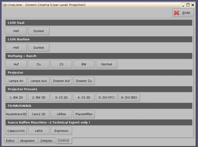 Das gehört aber zur Installation. Zumindest die Ansteuerung vom Projektor sollte in Makros organisiert werden. Und die beiden Passwörter sollten im Kino bekannt sein.