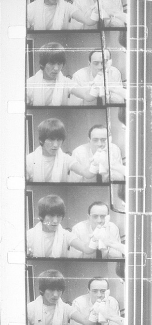 Von dem schrecklichen HARD DAY'S NIGHT habe ich seinerzeit schon aus "Beweissicherungsgründen" einen Scan gemacht. Das Negativ (!) befand sich bereits in einem erkennbar fortgeschrittenen Stadium der Selbstauflösung. Apart (und irgendwie kopierwerksuntypisch - merkwürdig) die Ausbesserung mit doppelt perforiertem Klebeband ... Nicht richtig deutlich wird im Scan, wie ungleichmäßig die Tonspur ausgeleuchtet war ...