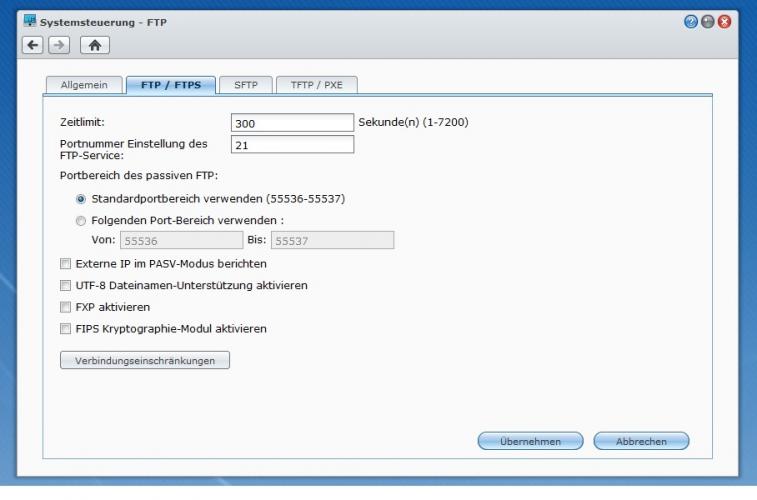 Der Dolby selbst hat da wenig Konfigurationsspielraum. Was für Optionen bietet die Synology denn beim FTP Server an?