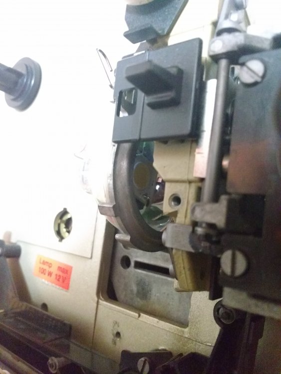 Ihm wurden alle Blendenflügel geklaut für ausreichend Auslösezeit. Die Blende ordentlich zu entfernen ist entweder seeeehr aufwendig oder garnicht möglich, so genau konnte ich das nicht sehen. Jedenfalls empfehle ich die fetten Eumigflügel einfach abzuflexen, vorher aber den Projektorinnenraum gut abdecken, dass die Späne nicht überall hinfliegen. Sauber machen ist so oder so ne Halbtagesaufgabe.
