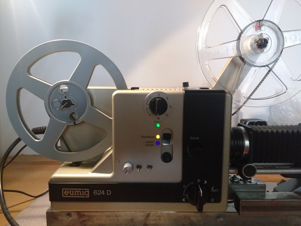 Auf der anderen Seite hängt der Eumig 624D. Warum dieser? Er hat mich 20€ gekostet ? Jeder Projektor hat sicherlich Vor- und Nachteile, der Eumig ist halt ultra-stabil (und schön!), kann dafür nicht sooo leicht in der Geschwindigkeit eingestellt werden.