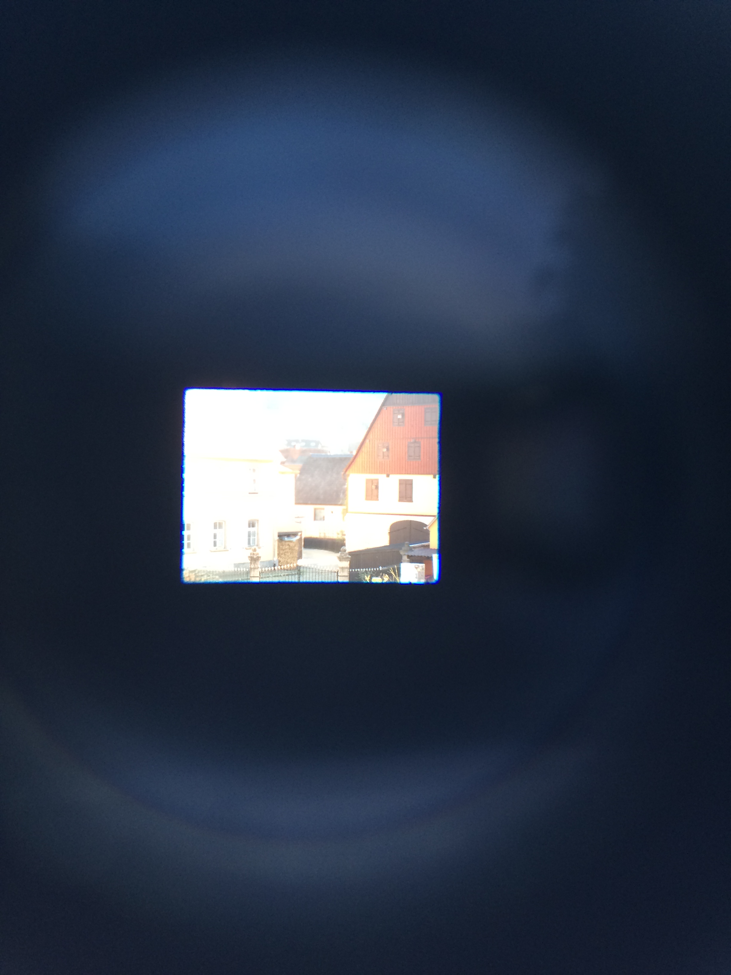 Schließt man die Blende bei Betrachtung der Mattscheibe, wird das Bild körniger (hier von der Handykamera etwas übertrieben körnig dargestellt. Auch die starke Vignettierung ist in Wirklichkeit nicht zu sehen):