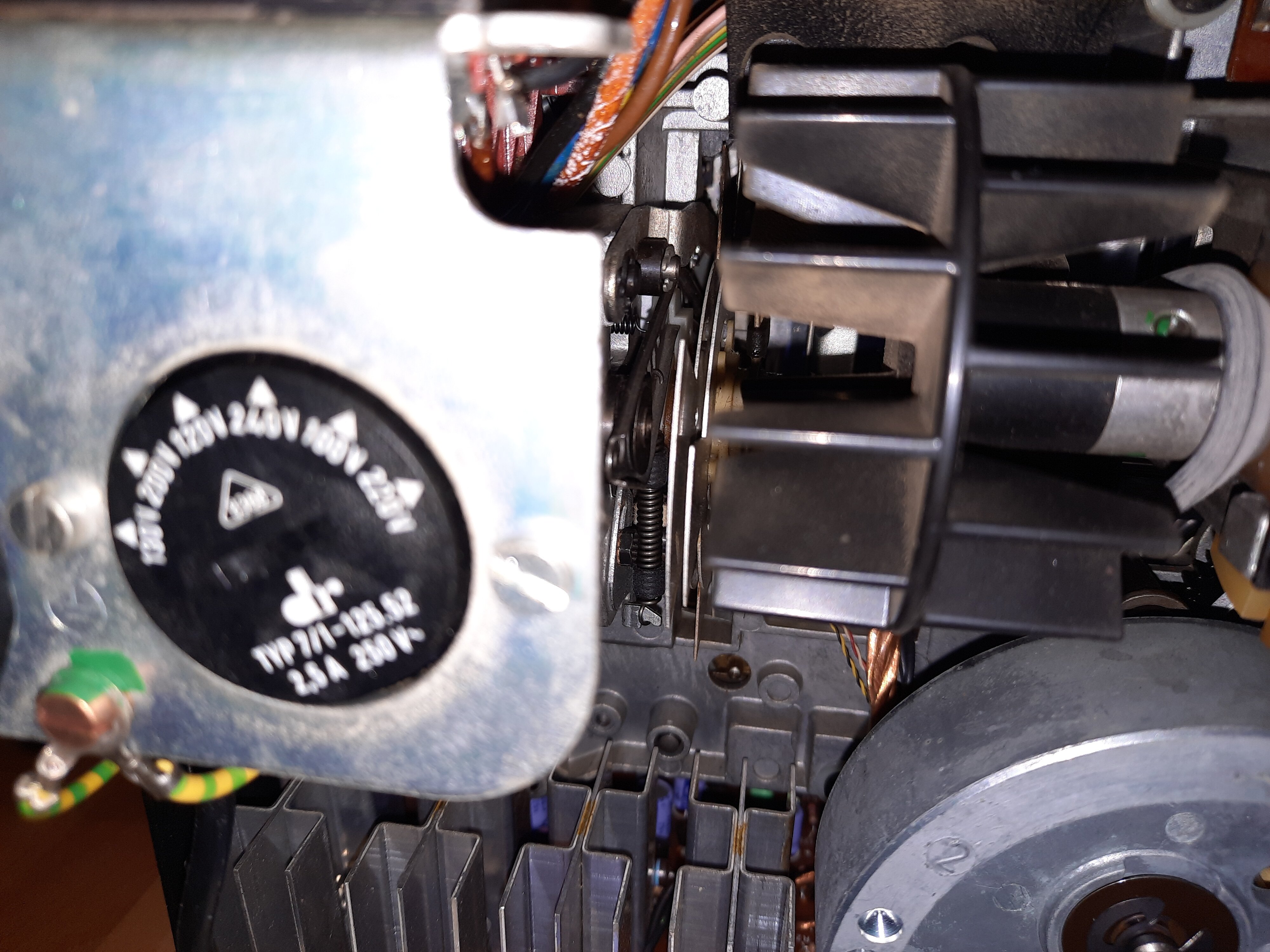 In der Praxis ist leider der Netztrafo davor - denn müßte man erst ablösen (2 große Schrauben oben, 1 Schraube unten links), aber nicht ausbauen, es reicht ihn etwas abzuziehen (Verkabelung nicht beschädigen!). Den Trafo in der einen Hand behalten, mit der anderen die 7er Mutter lösen und die Schraube drehen (s.o.).