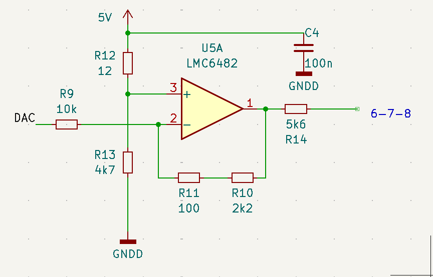 Um den gesamten Frequenzbereich des Bauers von ca. 9 bis 34 fps zu regeln, benötige ich eine Steuerspannung von nur 0,7 bis 1,75 Volt. Ein Volt ist nicht viel. Um präzise genug regeln zu können, verwende ich einen DAC (Digital-Analog-Converter) der 12 Bit Auflösung hat. Damit habe ich 4096 Regelstufen über den gesamten Bereich. Ein invertierenden OpAmp (Rail to Rail LMC6482AIN, ein rauscharmes und präzises Modell) mact aus den 0-5V des µC dann exakt die benötigten 0,7 bis 1,75 Volt. Hier stellte sich heraus, dass Steckbrett-Aufbauten nicht sonderlich gut für Spannungen im mV-Bereich sind — erst mit ordentlich verlöteter Elektronik kam ich zum Ziel: