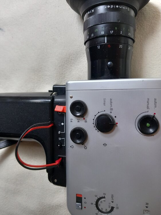 auf der Rückseite können die Laufgeschwindigkeiten und Einzelbild gewählt werden. Der Schieber oben ist in Mittelstellung für normalen Filmbetrieb. Nach links geschoben laufen Einzelbilder nach Wahl des Intervalltimer. Nach rechts geschoben starten Langzeitbelichtungen (für Nachtaufnahmen). Die Länge der Belichtungszeit steuert ein externer Sensor unter dem Objektiv.