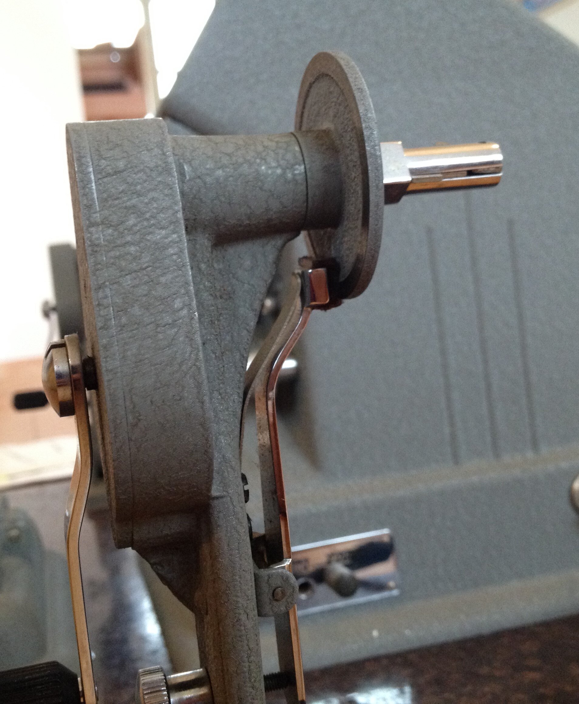 Die Umspuler sind jeder für sich bremsbar, damit der Film nicht einfach so abspult und es Bandsalat gibt